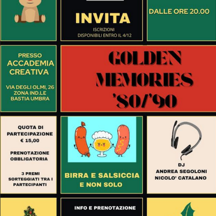 0 Bastia, BASTIA NEWS, Bastia Umbra, Cultura, Eventi Golden Memories ’80/’90 sabato 6 dicembre Pubblicato in: 27 Novembre 2025 Ogni giovedì dalle 15:30 alle 17:00 vi aspettiamo nella sede dell’Associazione Bastia Città, Piazza Cavour