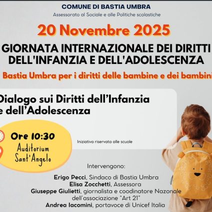 0 Bastia, BASTIA NEWS, Bastia Umbra, Cultura, Eventi 20 NOVEMBRE – BASTIA UMBRA CELEBRA LA GIORNATA INTERNAZIONALE DEI DIRITTI DELL’INFANZIA E DELL’ADOLESCENZA Pubblicato in: 17 Novembre 2025 COMUNICATO STAMPA COMUNE DI BASTIA UMBRA