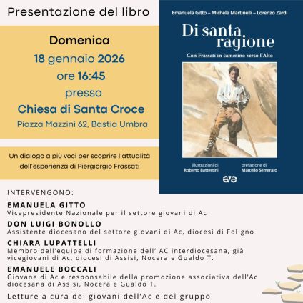 0 Bastia, BASTIA NEWS, Bastia Umbra, Cultura, Eventi, Religione IN CAMMINO VERSO L’ALTO: UN DIALOGO A PIU’ VOCI SULL’ATTUALITA’ DEL MESSAGGIO DI FRASSATI A BASTIA UMBRA 30 Dicembre 2025 Domenica 18 gennaio 2026, nella chiesa di Santa Croce, a Bastia la presentazione del libro “Di santa ragione”