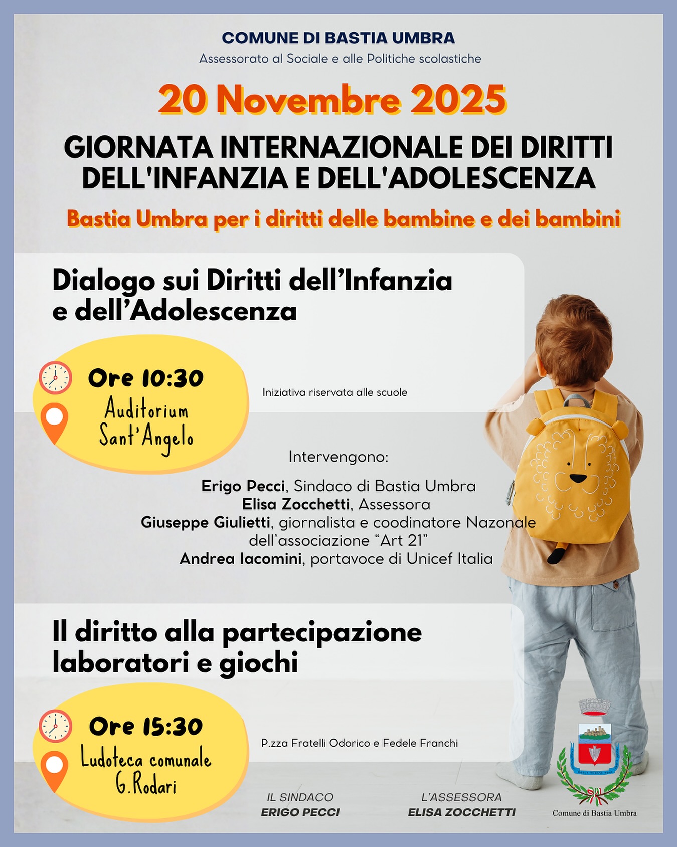 Il Comune di Bastia Umbra aderisce alle iniziative della Giornata internazionale dei Diritti dell’Infanzia e dell’Adolescenza, rinnovando l’impegno dell’Amministrazione nel promuovere una comunità che tutela, sostiene e valorizza le nuove generazioni.