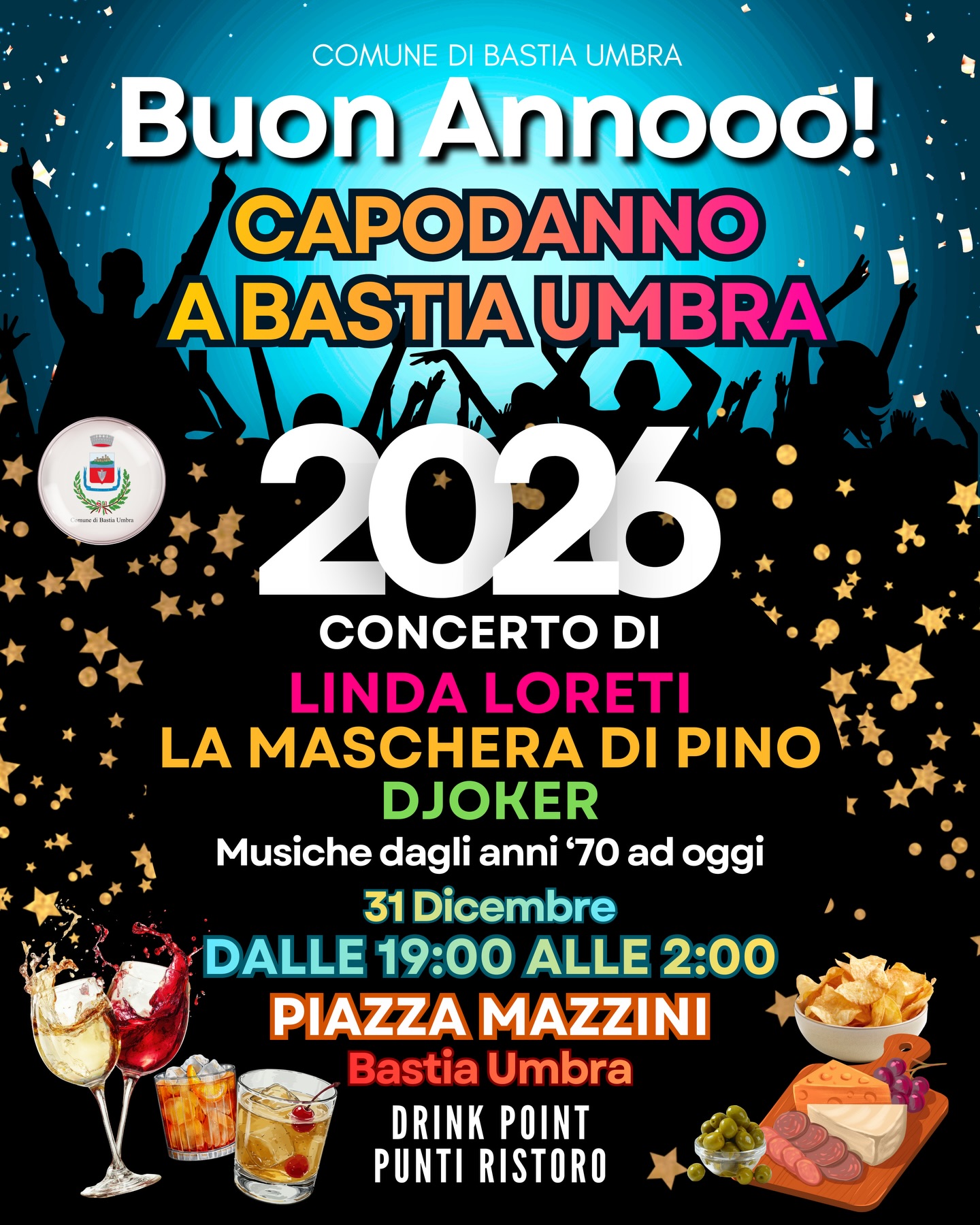 Il Comune di Bastia Umbra invita cittadini e visitatori a festeggiare l’arrivo del nuovo anno il 31 dicembre in Piazza Mazzini con una serata di festa, musica ed energia.
