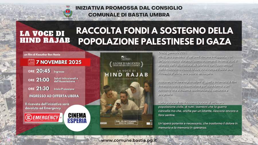 Il Comune di Bastia Umbra, con il sostegno dell’intero Consiglio Comunale, promuove una serata di sensibilizzazione e solidarietà a favore della popolazione palestinese e delle vittime del conflitto a Gaza.
