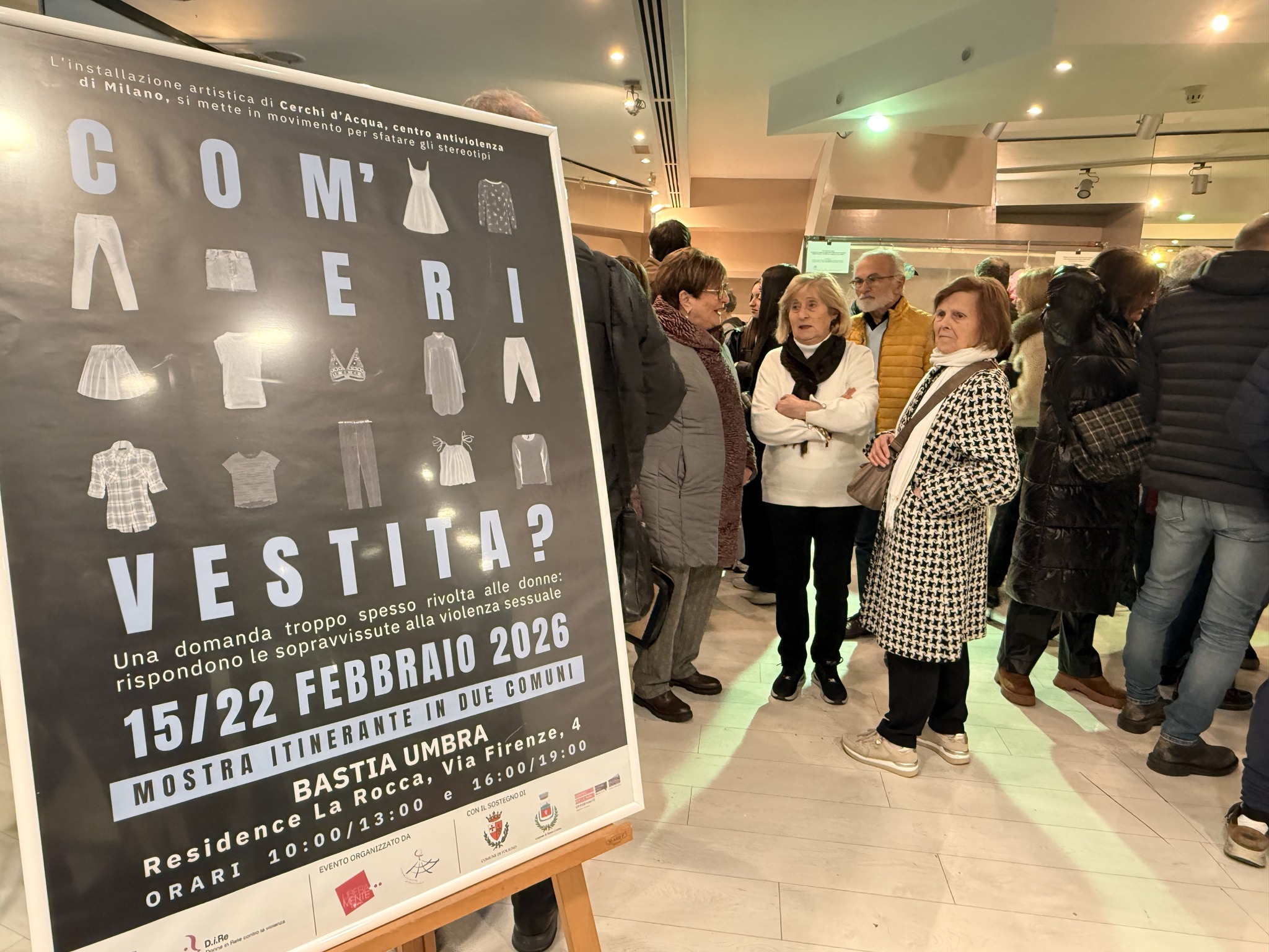 BASTIA UMBRA – Una mostra che vuole essere un invito alla responsabilità collettiva contro ogni forma di violenza: si può visitare, sino al 22 febbraio, la mostra “Com’eri vestita?“, allestita presso il Residence La Rocca in via Firenze. L’esposizione, realizzata dal Centro antiviolenza Cerchi d’Acqua, racconta storie reali di violenza sessuale attraverso abiti e testimonianze donati dalle donne. Oggetti quotidiani che diventano strumenti di memoria e consapevolezza, capaci di interrogare profondamente chi visita la mostra. «È una mostra che non lascia spazio alla superficialità. Gli abiti esposti, insieme alle testimonianze, raccontano storie vere, dolorose, che ci obbligano a guardarci dentro. Non sono semplici oggetti, ma prove di memoria e domande rivolte a ciascuno di noi». Così il sindaco Erigo Pecci intervenuto all’inaugurazione insieme all’assessora e vicesindaca Elisa Zocchetti. «La domanda ‘Com’eri vestita?’ rappresenta uno dei meccanismi culturali più insidiosi – ha proseguito il sindaco – perché sposta l’attenzione dalla responsabilità di chi compie violenza a chi la subisce. È nostro dovere affermare con chiarezza che la violenza non è mai giustificabile, né per come si è vestite né per qualsiasi altra condizione. La violenza è un atto di sopraffazione, mai la conseguenza di un abito o di una scelta personale». L’iniziativa è promossa dal Comune in collaborazione con il Punto d’Ascolto Antiviolenza della Zona Sociale 3, organizzata da Libera… Mente Donna e Rete Donne Antiviolenza.