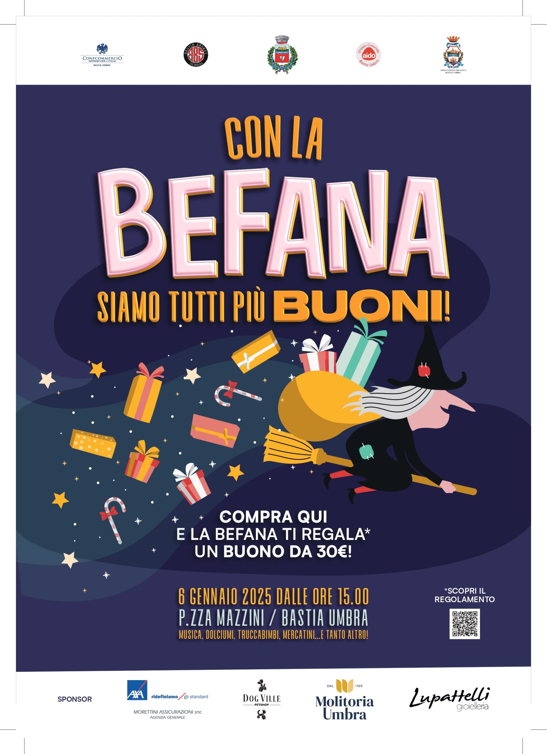 BASTIA UMBRA – Tutto pronto per il gran finale delle festività a Bastia Umbra. Martedì 6 gennaio, a partire dalle ore 15.30, Piazza Mazzini si vestirà a festa per ospitare la prima edizione di “Con la Befana siamo tutti più buoni!”, l’evento organizzato da Confcommercio Bastia pensato per sostenere il tessuto commerciale locale ed essere l’occasione di animare la città.