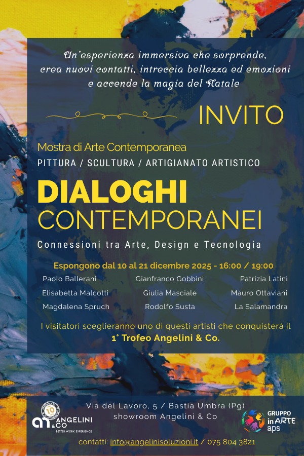Il percorso si apre il 10 dicembre alle ore 16:00 con la presenza delle autorità e un brindisi di benvenuto, segno di un dialogo che si inaugura tra arte e comunità. Si chiuderà il 21 dicembre alle ore 19:00, con i saluti di personalità note e istituzioni pubbliche e con la premiazione dell’artista vincitore del 1° Trofeo Angelini & Co., scelto direttamente dai voti dei visitatori.