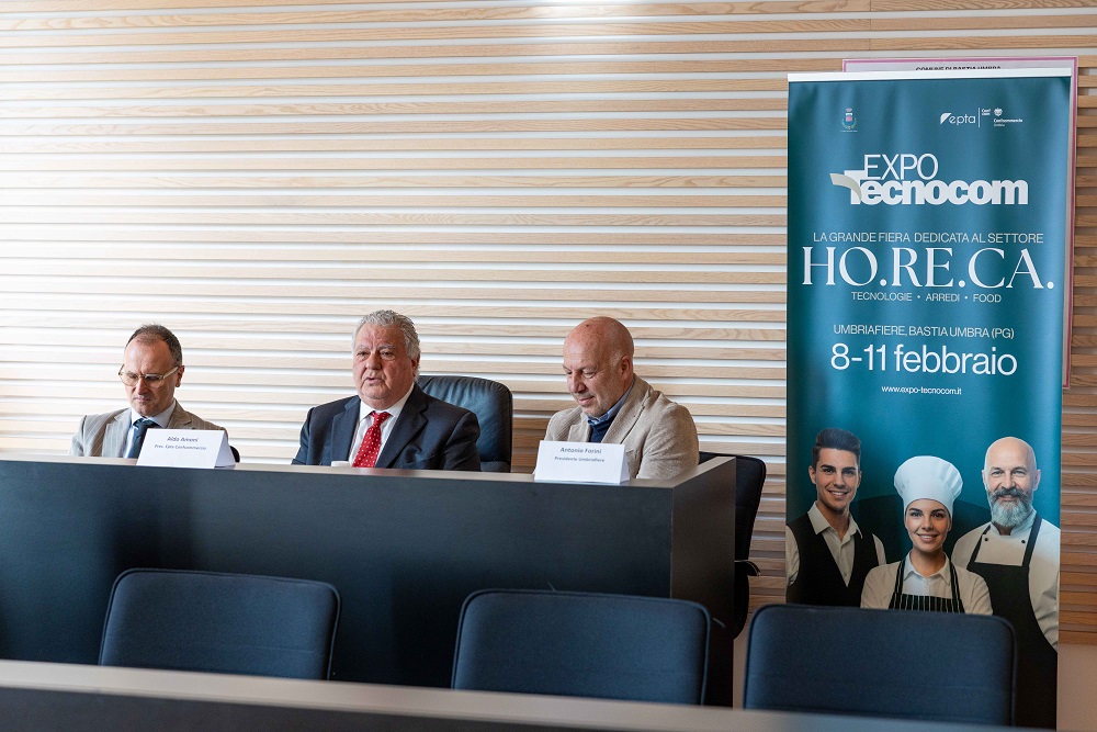 BASTIA UMBRA Presentata Expo Tecnocom 2026 dedicata ai pubblici esercizi, all’ospitalità e all’arte bianca (la produzione artigianale di prodotti da forno): si svolgerà dall’8 all’11 febbraio a Umbriafiere. Sono intervenuti Aldo Amoni, presidente di Epta Confcommercio Umbria che organizza l’iniziativa, il sindaco di Bastia Umbra Erigo Pecci e il presidente di Umbriafiere Antonio Forini, che hanno sottolineato il valore strategico della manifestazione per il tessuto economico locale e per l’intero comparto della ristorazione e dell’accoglienza. Vedrà la partecipazione di oltre 100 espositori distribuiti su 4 padiglioni, confermando la fiera come una delle principali piattaforme di incontro tra domanda e offerta per il settore Horeca. Anche per questa edizione saranno riproposte le tre macro aree tematiche: Food, Equipment e Contract. Tra gli elementi di maggiore richiamo il 4° Trofeo della Pizza (lunedì 9 febbraio, ore 10), organizzato da Molino Sul Clitunno. Il programma propone poi cooking show e dimostrazioni tecniche organizzati direttamente dalle aziende protagoniste del settore: Dac firma una serie di appuntamenti dedicati alla valorizzazione delle materie prime e alle tecniche di lavorazione, con la partecipazione dello chef stellato Pasquale Palamaro e del campione mondiale della pizza Pasquale Moro; VeganOK Academy cura invece gli eventi dedicati alla cucina vegetale e all’innovazione gastronomica. «Expo Tecnocom è un luogo in cui contenuti, competenze e relazioni si trasformano in strumenti utili per chi opera nel mondo dei pubblici esercizi, dell’ospitalità e dell’arte bianca» ha detto Amoni. Per il sindaco Pecci «Umbriafiere, centro che ha la capacità di portare a Bastia tanta tecnologia, innovazione e servizi, legati in questa occasione all’Horeca». Il presidente Forini ha sottolineato come Expo Tecnocom sia «alzi il livello di Umbriafiere».
