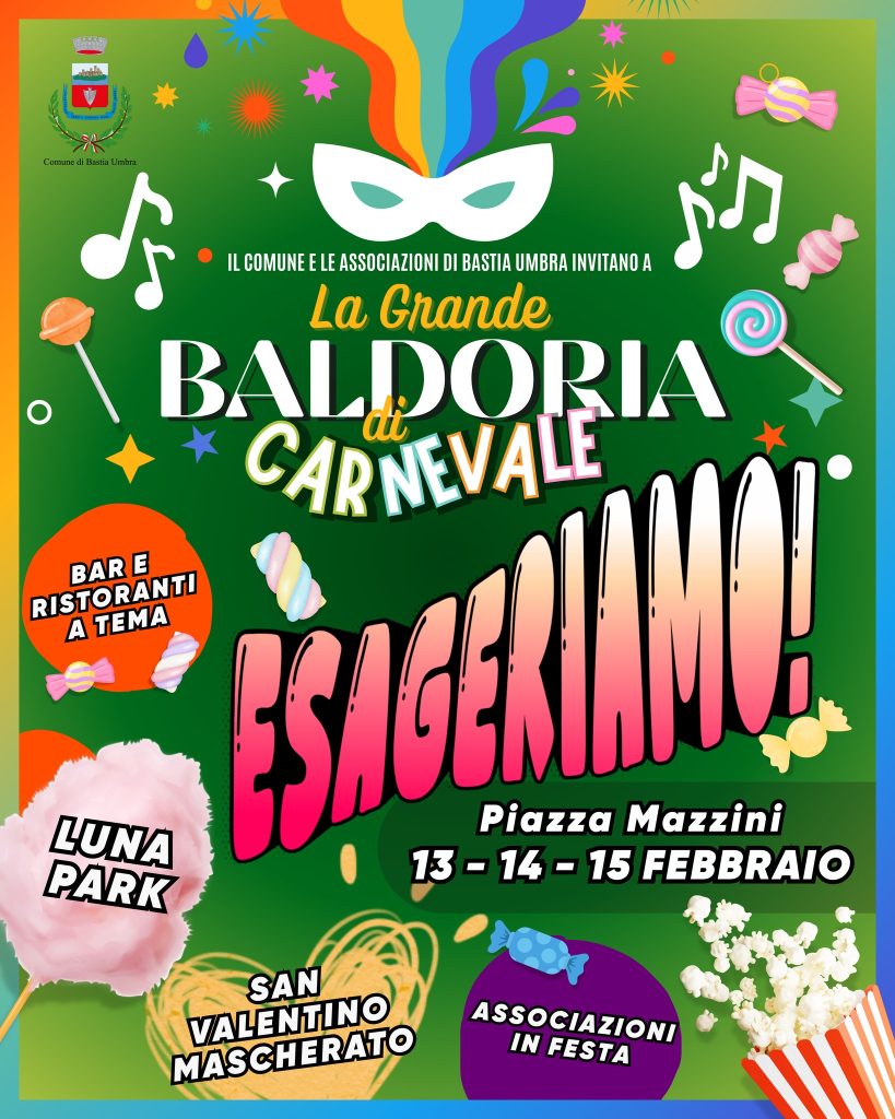 BASTIA UMBRA – In corso “La Grande Baldoria di Carnevale“, dal titolo “Esageriamo“: in Piazza Mazzini, nell’Area ex Pronto e in Piazza Cavour, è attivo il Luna Park di Carnevale: un’area di attrazioni e giochi per tutte le età. Oggi, San Valentino, dalle 16 alle 19 sempre in Piazza Mazzini, spazio ai gazebo delle associazioni cittadine con giochi e animazione per bambini, in un clima di festa e partecipazione condivisa. Dalle 17 alle 23 arriva una delle novità più attese: San Valentino Mascherato, iniziativa realizzata in collaborazione con la Confcommercio di Bastia Umbra. Domani il culmine con La Grande Baldoria: Esageriamo, con una postazione fissa di conduzione, regia, animazione e DJ in piazza, a partire dalle 15 per i più piccoli con l’intrattenimento a cura della ludoteca comunale “Gianni Rodari“ e alle 17 per i più grandi con Andrea Esse DJ set con «tutta la musica in piazza», per chiudere il Carnevale con ritmo e allegria.
