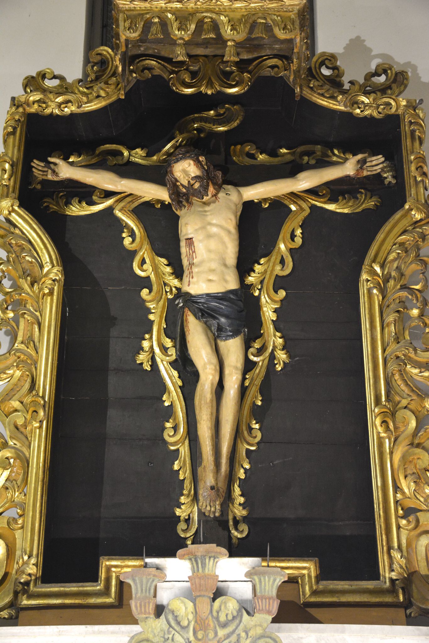 L’opera, un crocifisso ligneo policromo e dorato risalente al XVI-XVII secolo, utilizzata ogni Venerdì Santo nella suggestiva processione del Cristo Morto, rappresenta uno dei più significativi esempi di arte sacra post-tridentina del territorio. Il Cristo colpisce per il realismo drammatico e la ricchezza dei dettagli, testimonianza di secoli di devozione e di maestria artistica, presenta una caratteristica molto diffusa in Umbria, ovvero la presenza di braccia retrattili per la deposizione dalla croce durante la liturgia del Venerdì santo.