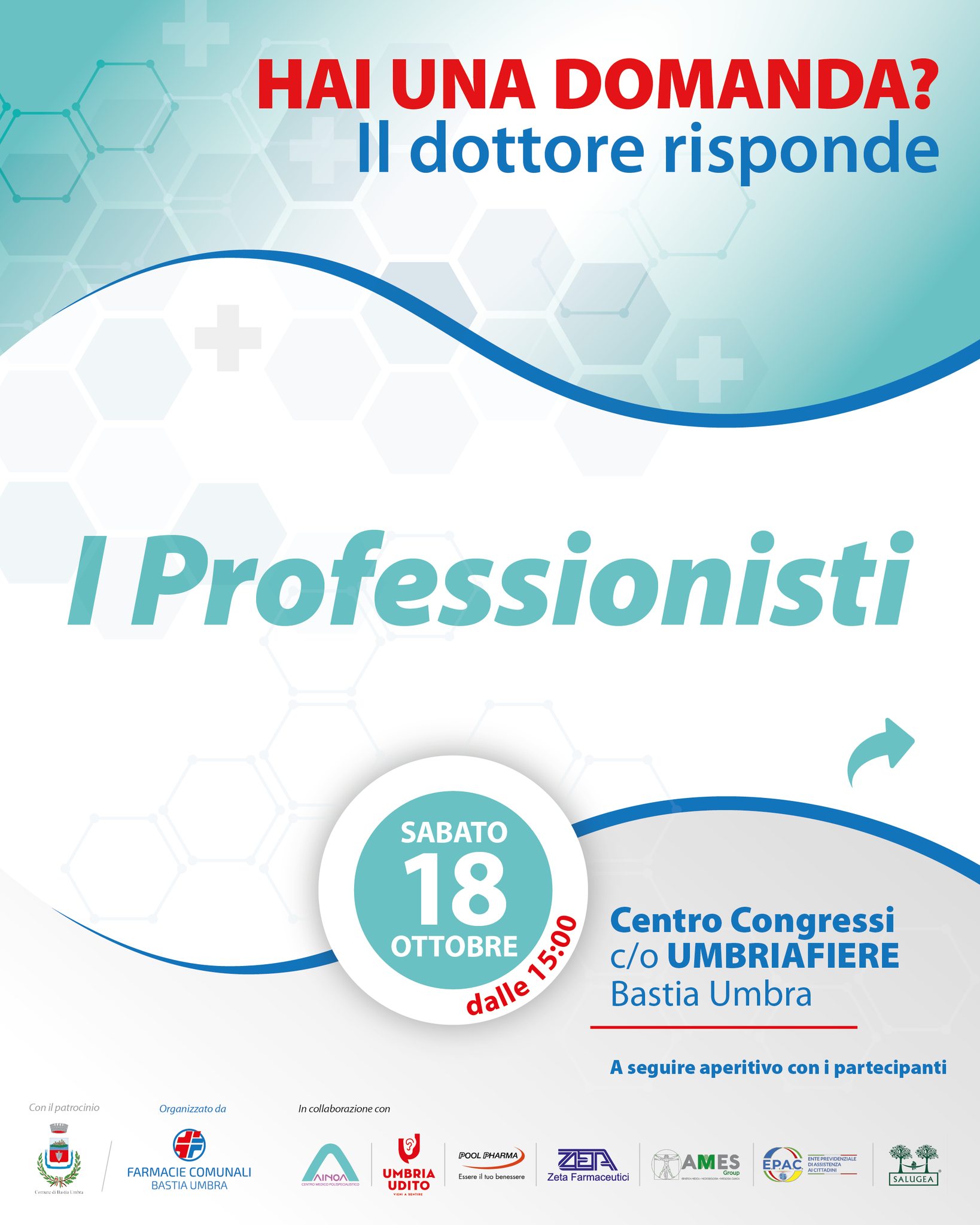 BASTIA UMBRA Hai una domanda? Il dottore risponde. L’evento si tiene sabato pomeriggio dalle 15 al centro congressi Umbriafiere, mediatrice dell’incontro Roberta Gabrielli responsabile del settore Farmacie del comune di Bastia Umbra. Evento aperto a tutti i cittadini, 15 i professionisti a disposizione: Antonio Artegiani (endocrinologia), Andrea Boccolini (proctologia e pelviperineologia), Massimo Balzana (gastroenterologia e endoscopia digestiva), Nicola Fiorenza (pneumologia e allergologia), Roberto Ricciardi (ginocologia), Andrea Leli (ortopedia e traumatologia), Gabriele Casciola (dermatologia e venereologia), Gianfranco Salierno (psichiatra), Giulia Milillo (angiologia e malattie vascolari), Silvia Arnone (nutrizionista e diabetologa), Isabella Tritto (cardiologia), Piero Sebastiani (medicina legale) e Paolo Giuggi (urologia). A seguire aperitivo per i partecipanti.