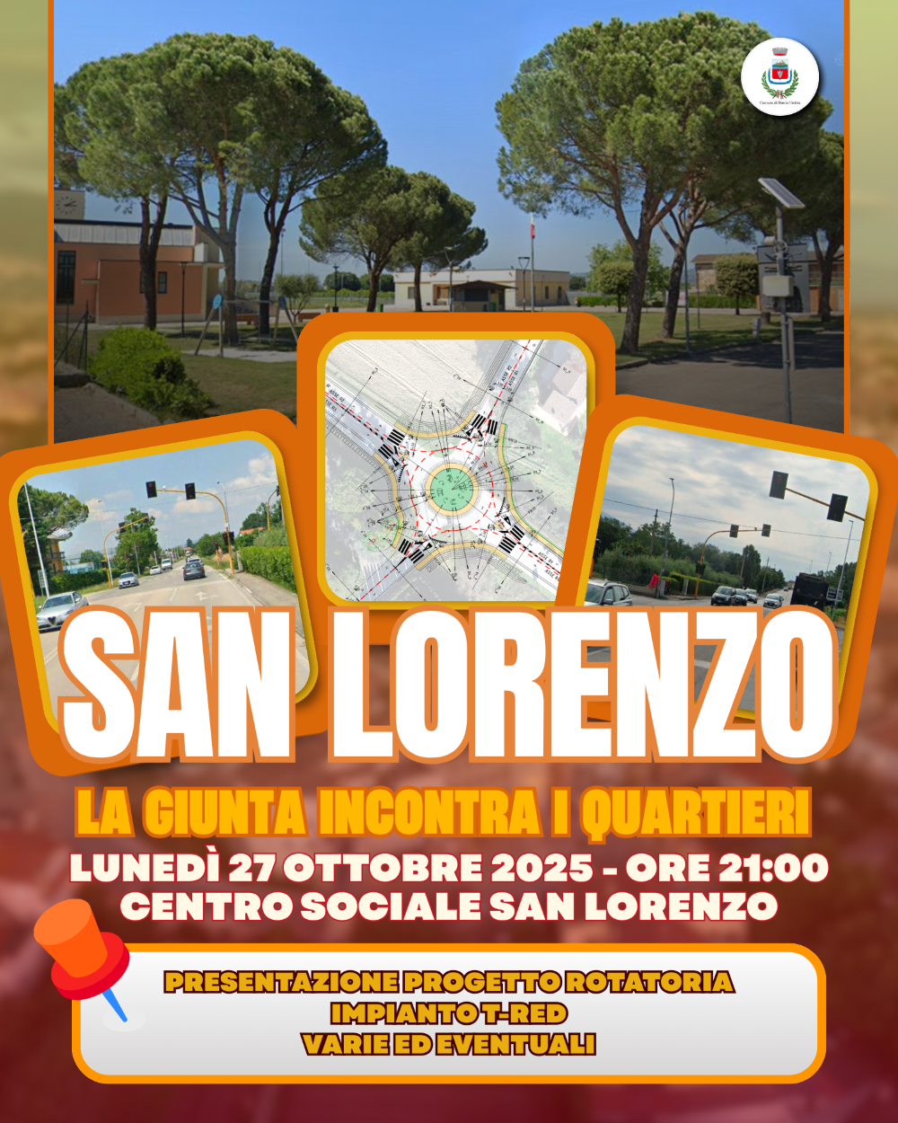 Lunedì 27 Ottobre 2025, alle ore 21:00, i cittadini sono invitati al Centro Sociale di San Lorenzo per presentare i dettagli del Progetto della nuova rotatoria all’intersezione tra Via Höchberg, Via Atene e Via delle Nazioni.