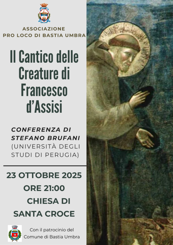 Seguendo il tema ispiratore della sezione poesia del Premio Insula Romana – PIR 2025, la Pro Loco di Bastia organizza Giovedì 23 ottobre ore 21 presso la Chiesa di Santa Croce una conferenza dedicata al Cantico delle Creature di San Francesco.