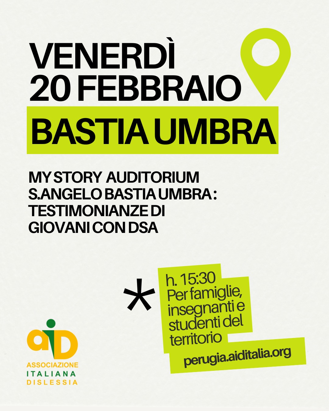 Il progetto My Story, promosso dall’Associazione Italiana Dislessia per dare voce ai giovani con Disturbi Specifici dell’Apprendimento, fa tappa in Umbria con due giornate e quattro eventi rivolti a studenti, docenti, famiglie e cittadinanza. Gli appuntamenti si terranno venerdì 20 febbraio e venerdì 6 marzo ad Assisi, Bastia Umbra e Perugia. L’iniziativa ha l’obiettivo di stimolare una riflessione positiva e consapevole sui DSA attraverso le testimonianze dirette dei volontari del Gruppo Giovani AID, ragazzi e ragazze che raccontano in prima persona il proprio percorso scolastico e di vita, le difficoltà incontrate, le strategie messe in atto e le risorse sviluppate nel tempo. Il racconto in prima persona diventa così uno strumento efficace di sensibilizzazione, capace di creare immedesimazione, abbattere stereotipi e favorire il dialogo tra pari. La prima giornata di incontri è in programma venerdì 20 febbraio. In mattinata, dalle 9.30 alle 12, il progetto My Story farà tappa all’Auditorium Santa Maria degli Angeli di Assisi con un evento riservato agli studenti e ai docenti delle scuole secondarie di primo e secondo grado dei territori di Assisi, Bastia Umbra e Foligno. La partecipazione avviene su prenotazione, da effettuare tramite apposito modulo online, la cui compilazione è riservata ai docenti, chiamati a indicare il numero indicativo di studenti partecipanti. Nel pomeriggio, dalle 15.30 alle 17.30, l’incontro si sposterà presso l’Auditorium Sant’Angelo di Bastia Umbra e sarà aperto a famiglie, insegnanti e studenti del territorio, sempre con iscrizione tramite modulo online. Il secondo appuntamento è previsto per venerdì 6 marzo a Perugia. In mattinata, dalle 9.30 alle 12.00, My Story sarà ospitato presso la Sala dei Notari con un incontro riservato agli studenti e ai docenti delle scuole secondarie di primo e secondo grado di Perugia. Dalle 15.30 alle 17.30, nella Sala dei Notari, l’evento sarà aperto a famiglie, insegnanti e studenti.