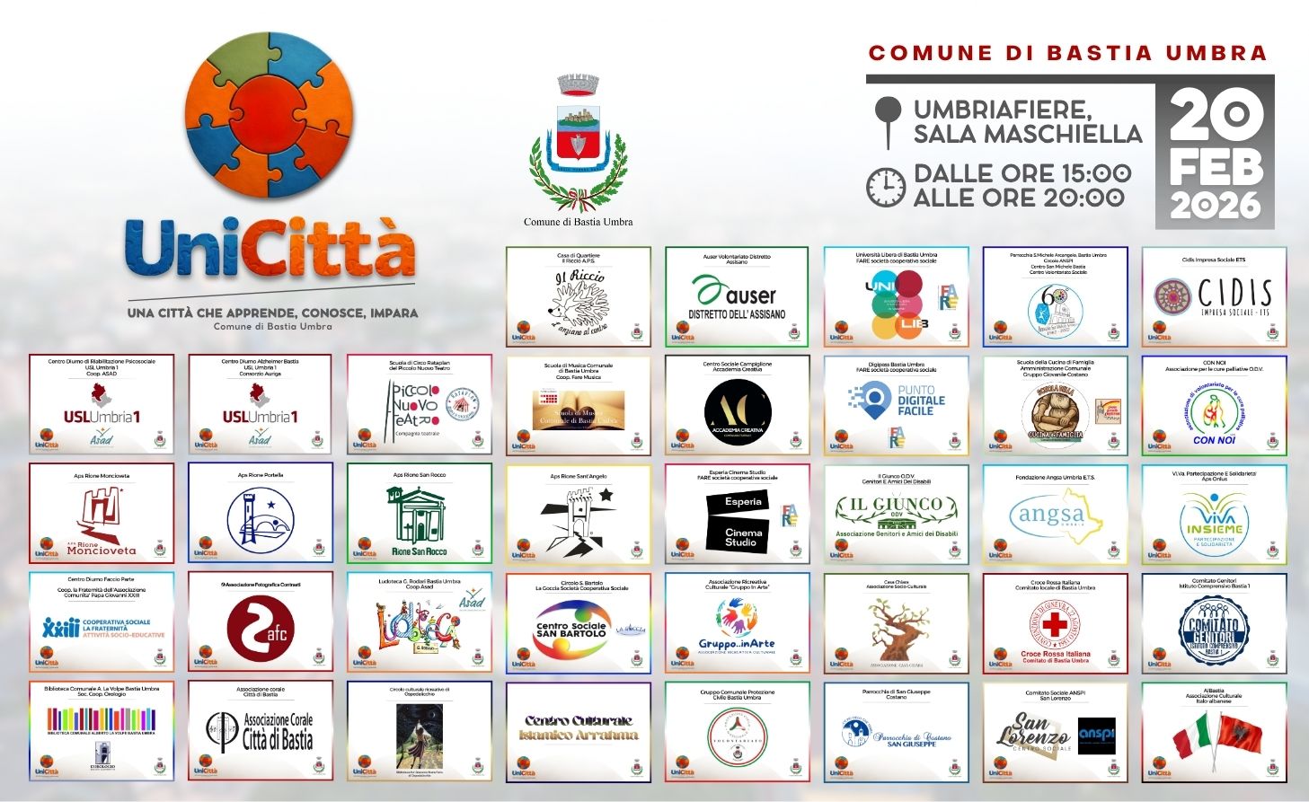 BASTIA UMBRA – Il Comune presenta UniCittà, progetto che riconosce e valorizza un patrimonio già vivo sul territorio: la fitta rete di associazioni, enti e realtà che ogni giorno alimentano l’apprendimento permanente, offrendo occasioni di conoscenza, crescita, competenze e relazioni per tutte le età. Appuntamento oggi alla Sala Maschiella di Umbriafiere dalle 15 alle 20. Durante l’iniziativa, i protagonisti della rete saranno presenti con postazioni dedicate per raccontare e illustrare le proprie attività alla cittadinanza. Tra i soggetti coinvolti biblioteca, ludoteca e scuola di musica, parrocchia San Michele, Croce rossa, Protezione civile, centri diurni Usl 1, centri sociali, Rioni e tante altre realtà associative.