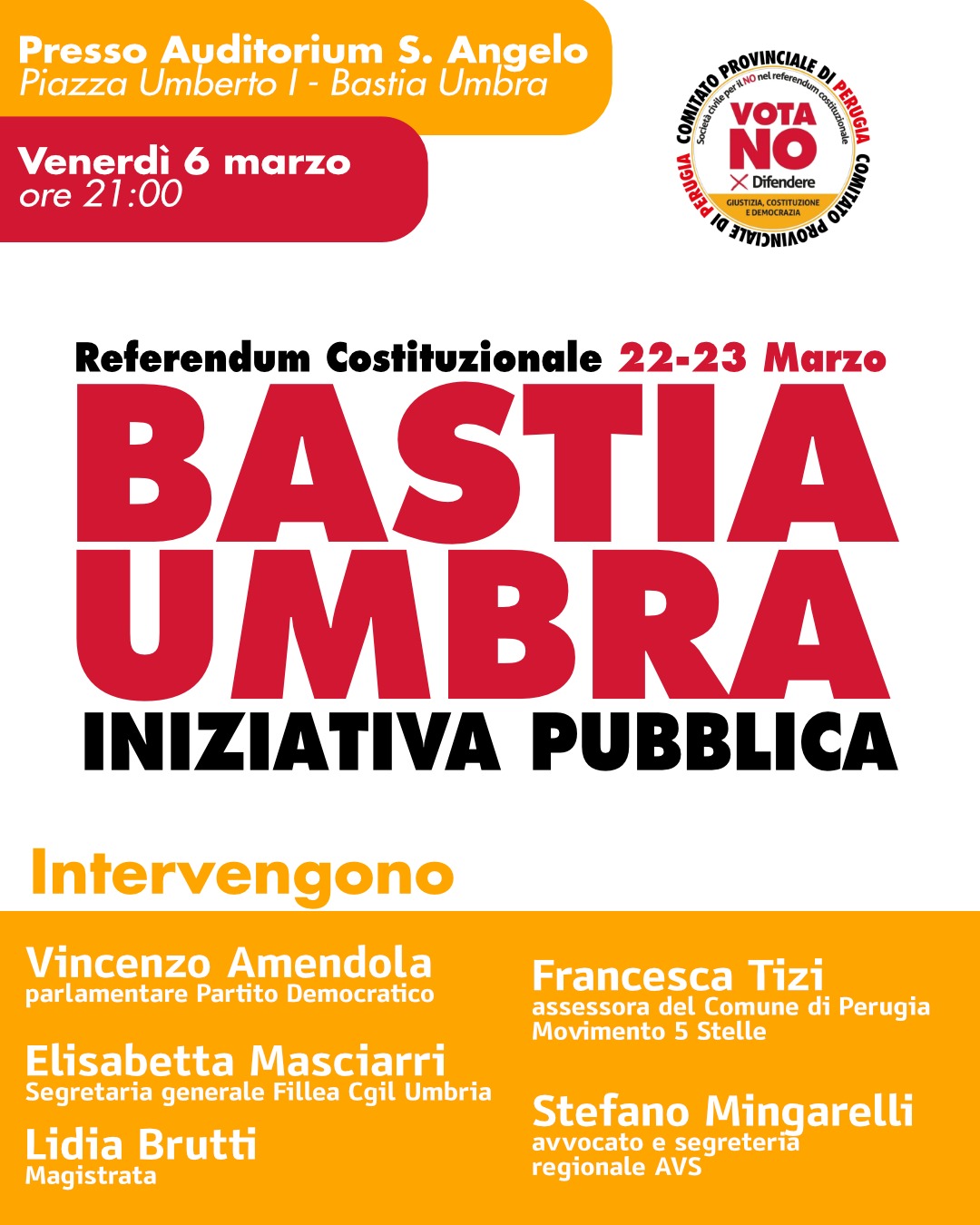 BASTIA UMBRA Il Partito Democratico, il Movimento 5 Stelle, Alleanza Verdi Sinistra, le liste civiche e la CGIL informano la cittadinanza di aver promosso e organizzato, in un percorso condiviso di rete territoriale e collaborazione politica, l’iniziativa pubblica dal titolo “Bastia Umbra – Referendum Costituzionale”, che si terrà venerdì 6 marzo alle ore 21.00 presso l’Auditorium Sant’Angelo di Bastia Umbra.