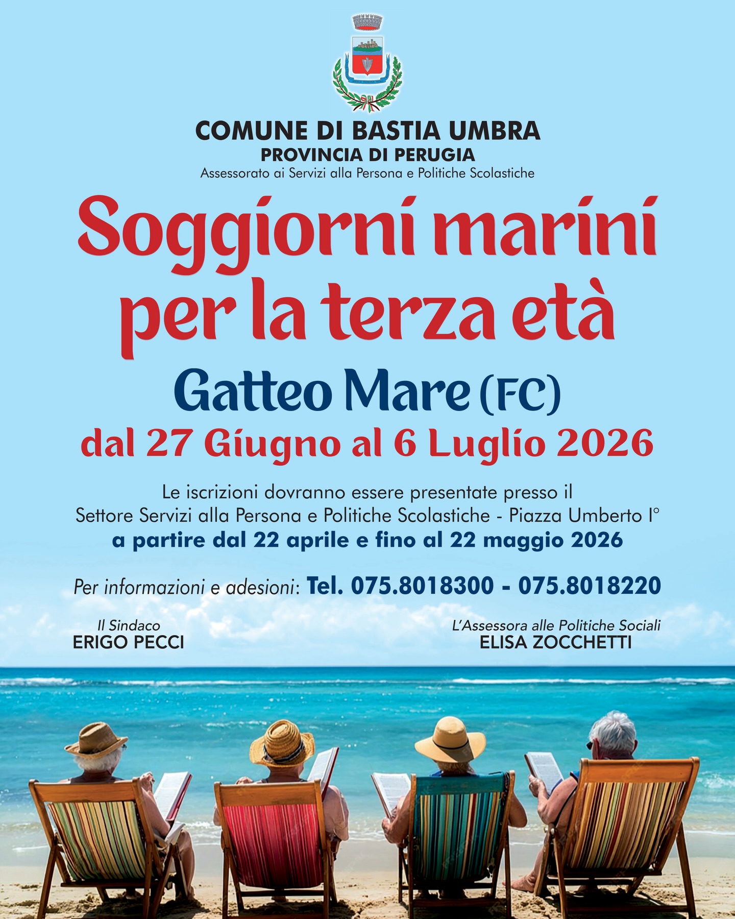 Il Comune di Bastia Umbra, attraverso l’Assessorato ai Servizi alla Persona e Politiche Scolastiche, promuove anche per il 2026 l’iniziativa dei soggiorni marini per la terza età, un’opportunità di svago, socializzazione e benessere dedicata ai cittadini senior.