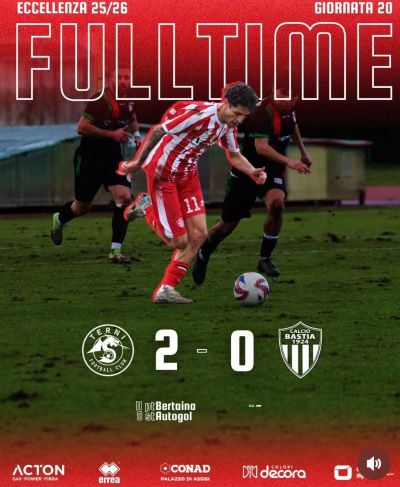 TERNI Termina 2-0 il match tra Terni Fc e Bastia nella gara valevole per la ventesima giornata del campionato di Eccellenza. L’incontro si sblocca all’11’ del primo tempo grazie a Bertaina: Bagnato crossa direttamente da calcio di punizione, sul traversone arriva proprio l’attaccante ex Cannara che devia di testa, supera Rossi e porta avanti i suoi. Nella prima frazione di gioco, dopo la rete che ha sbloccato il parziale, arriva qualche conclusione da fuori, ma entrambi i portieri si fanno trovare pronti. Nella ripresa, dopo il brivido arrivato sull’errore di Cunzi (Bigarelli non ne approfitta e si lascia ipnotizzare proprio dal portiere locale)c il Terni Fc raddoppia: Esposito crossa dalla destra, Giabbecucci interviene ma scaraventa la palla nella propria porta. Dopo questo autogol sfortunato il Terni Fc inizia a gestire: il ritmo cala drasticamente, inizia la girandola dei cambi e il match si gioca soprattutto a centrocampo, con qualche sporadica conclusione. Dopo 4 minuti di recupero non c’è più tempo: il Terni Fc batte il Bastia per 2-0.